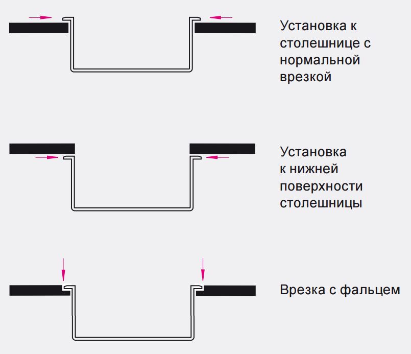 Варианты монтажа: встраиваемая в столешницу сверху/заподлицо со столешницей (вровень со столешницей);